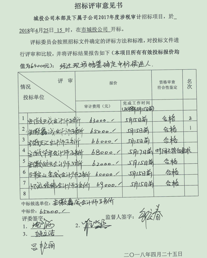 城投公司本部及下屬公司2017年涉稅審計招標結果公示